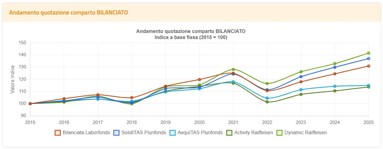 Di seguito si riporta un’analisi grafica dei rendimenti realizzati dei fondi pensione nel decennio 2015–2025. L’analisi grafica è basata sulle categorie di comparti definite dalla COVIP e comprende le linee di investimento comparabili dei quattro fondi pensione partner di Pensplan Centrum S.p.A. Non vengono invece rappresentate le linee di investimento istituite dopo il 31/12/2015.